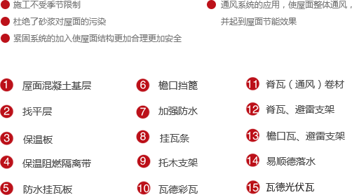 借鑒歐洲坡屋面防水理念,將平面防水改為立體防水,采用新型防水板材料,將材料防水和構造防水于一身,配合屋面系統組件,實現全天候全干作業。節省了屋面各類保護層次,打破了屋面冬季及雨后陰濕無法施工的常規,縮短了工期,提升系統安全性能。